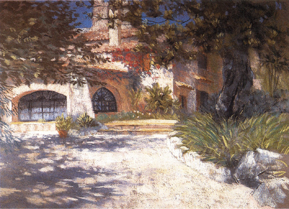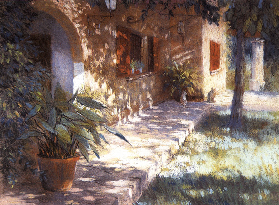 In this picture the eye is led towards the background, despite the important foreground element of a large potted plant on the left. The reason that the plant does not hold the viewer in the foreground is that the ground shadows link with the plant. The close tones in this foreground area hold together well, allowing the eye to move back gently, not only via the linear element of the path, but also across the bands of light and shade, which diminish gradually in size.