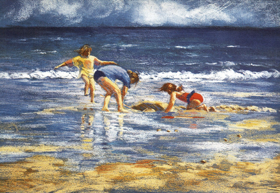 This painting is composed of horizontal bands of colour, and the foreground area between the base of the picture and the focal point of the three children was quite deep and so potentially tricky – it could have been rather bland and boring. However, I emphasized the undulations in the sand, and the areas of blue, to break up the foreground in a lively and interesting way. Marks in the foreground are much larger than those in the distance, too, helping the sense of depth.