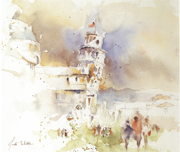The leaning tower of Pisa (opposite) is so well known that it is difficult to keep the spirit of the place and to paint it as if you are looking at it for the first time. Also I had to ‘edit’ extensive ‘rescue’ works around the base of the building. It was hard not to exaggerate the ‘lean’ on the tower. In this case the sketch needed to be accurate as well as conveying the beauty of this exquisite structure. It was interesting to observe that the flagpole on top of the tower was vertical. Here the sketchbook was useful, too, to record the people and incorporate them into the study, rather than make them look as if they were an afterthought.