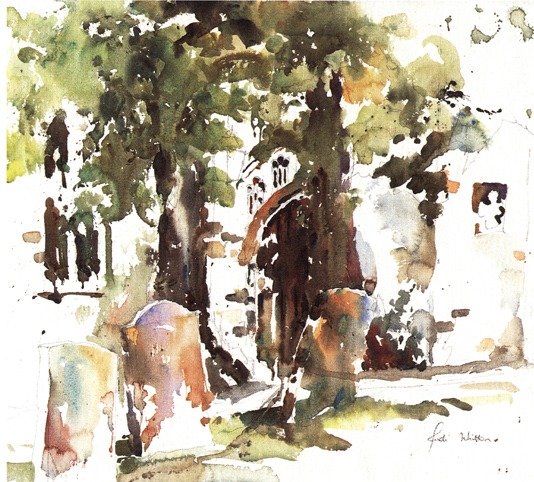 The painting of the Churchyard, Stow on the Wold (above) is included here even though I decided to make no preliminary sketch for it. I looked at the subject for some time and made decisions, and then just painted it. Sometimes I prefer not to give any concentration to the sketch and save all my resources for the painting. Bearing in mind the expression ‘analysis leads to paralysis’, I worry sometimes about the slight risk of over-preparing for a painting and going a bit stale, especially as watercolours often benefit from a feeling of spontaneity. But there is no substitute for doing a lot of thinking before and during the painting.