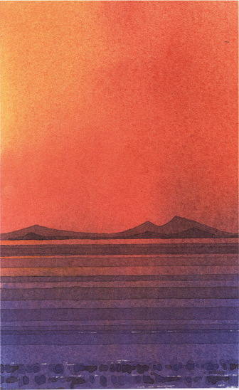 This small painting was started with a variegated wash onto damp paper. This encouraged colours to flow together in a clean and spontaneous way. After allowing this first wash to dry, other washes were laid on top to suggest mountain and wave forms. The white highlights were scratched out with a sharp blade.