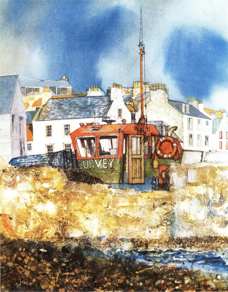 Linear perspective was used in the drawing of the houses and the boat’s cabin. Notice that because the house tops are above us the roof lines slope down into the distance and we cannot see the top surfaces of the chimney supports. Aerial perspective has been suggested by using lighter tones and gentler contrasts in the background, saving the stronger effects for the middle and foregrounds. Overlapping was used extensively.
