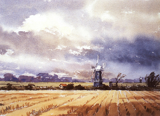 For the purposes of the two demonstration pictures of a cloudy sky above, I used a combination of French Ultramarine and Burnt Umber predominantly. My other usual colours are Cobalt Blue, Coeruleum, Light Red and Raw Sienna. A blue sky may gradate from Ultramarine to Cobalt Blue to Coeruleum towards the horizon as a result of refraction through the atmosphere. Often there is a warm glow just above the horizon, for which I use dilute Raw Sienna. Light Red is mixed with French Ultramarine or Cobalt Blue to create a cooler grey for distant clouds that are near the horizon.