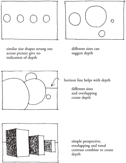 There are several ways in which you can suggest depth: perspective, tone, overlapping, and weight of texture or line. In practice any picture will use a combination of these.