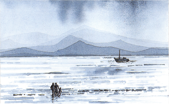 I placed the horizon high in the rectangle to leave plenty of space for the foreground. In this way I was able to use the wave tops and edges, and the edge of wet sand, to draw the eye firmly towards the fishermen. A large foreground emphasized the emptiness of the beach, bar a few fishermen, and gave me the opportunity to paint the wonderful light on the sea, which was as important an element as any other in the picture.
