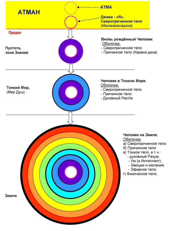 Душа пребывает на Земле в четырёх телах – оболочках, которые она надевает по мере нисхождения из Центра Мира в земную школу. Обычно в ведической литературе называют три тела, но правильнее говорить о четырёх оболочках, так как Джива (Высшее причинное тело или Махакарана-деха) – это также оболочка Атмы – внутренней Сути Человека.