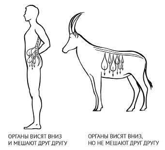 К каждому органу подходят сосуды, которые кроме своей прямой функции выполняют роль некоего, пусть и не особо прочного, но все же каркаса. Механизм фиксации для каждого отдельно взятого органа свой, но принципы остаются одинаковыми для всех. И поскольку мы ходим вертикально, а не горизонтально, как кошки, собаки и прочие животные, то с течением времени под воздействием гравитации, сидячего образа жизни, слабого тонуса мышц живота, который не удерживает органы в правильной позиции, или под воздействием травм, сотрясений, ударов, падений или каких-либо спаечных процессов, которые начинают тянуть органы вниз, органы начинают опускаться. Антилопа может хоть всю жизнь скакать и убегать от гепардов, и ничего у нее от этого не опустится и не испортится, потому что у нее, как и у других животных, горизонтальное расположение тела и органы висят относительно позвоночника вниз, свободно двигаясь в брюшной полости и не мешая друг другу, а у прямоходящего человека все не так (рис. 2).