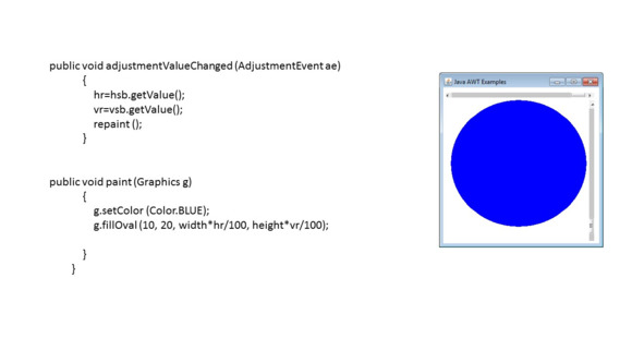 В методе paint мы рисуем круг с диаметром, на основе значений полос прокрутки.