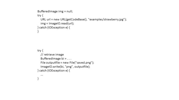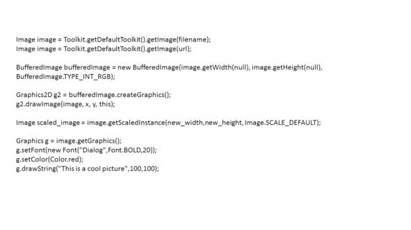 Что касается изображений, Java 2D API позволяет загрузить внешний файл изображения формата GIF, PNG, JPEG во внутреннее представление изображения, используемое Java 2D.