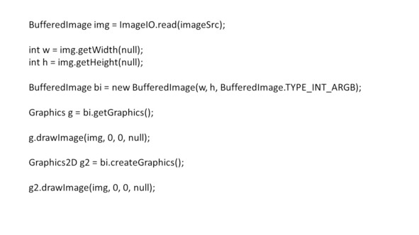 Поэтому, получив изображение из внешнего источника, мы создаем пустое изображение того же размера, получаем из него объект Graphics2D, и используем его для отрисовки нашего изображения.