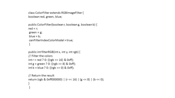 Класс ColorFilter расширяет класс RGBImageFilter и содержит три логические переменные, которые определяют, какие цвета должны быть отфильтрованы из изображения.