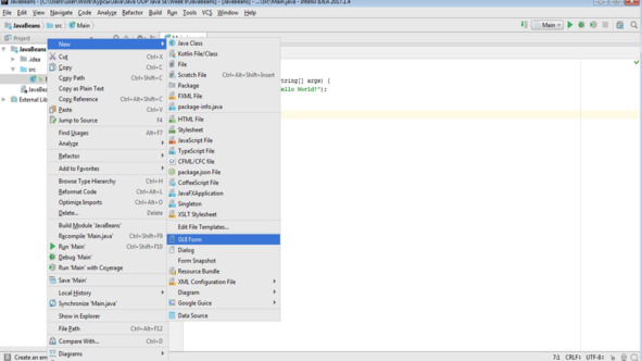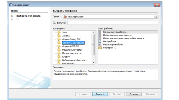 В среде разработки NetBeans можно легко создать компонент JavaBeans с помощью меню New проекта приложения.