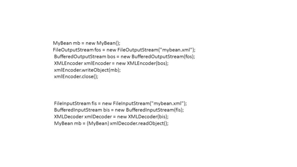 Соответственно с помощью класса XMLEncoder, можно легко восстановить потом объект из XML-файла.