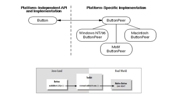 Каждая реализация среды выполнения Jave Runtime Environment должна обеспечивать собственные реализации кнопок, меток, панелей и всех других компонентов AWT.