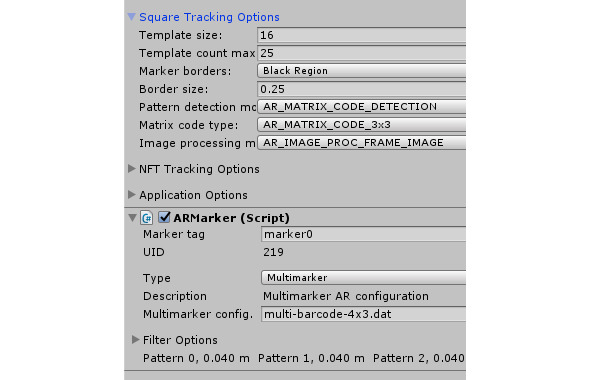Для использования маркера Multimarker в свойствах ARController скрипта в разделе Square tracking options в поле Pattern detection mode выберем AR_MATRIX_CODE_DETECTION, в свойствах ARMarker скрипта в поле Type выберем Multimarker, в поле Multimarker config. введем имя конфигурационного файла из каталога StreamingAssets.