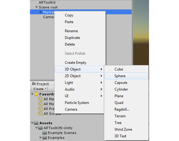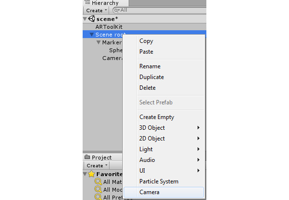 С помощью меню Create/Create Empty Child создадим объект GameObject, дочерний для объекта Scene root, который назовем Marker. Перетащим из папки Scripts в объект Marker скрипт ARTrackedObject, представляющий маркер. Его дочерние объекты будут автоматически прикрепляться к этому маркеру.