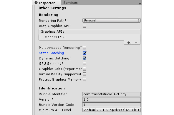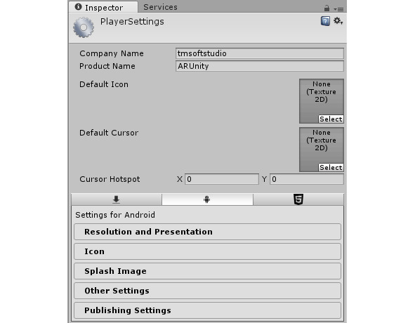 Кнопка Player Settings открывает окно настроек сборки приложения.