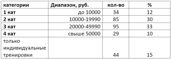 На основании полученных данных можно утверждать, что в фитнес-клубах Санкт-Петербурга в настоящее время нет прямой связи между качеством услуг, «позиционированием» клуба и стоимостью услуг.