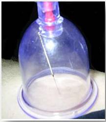 Происходит совмещение иглоукалывания с Хиджамой. Сначала ставится иголка и сверху иглы ставится банка.