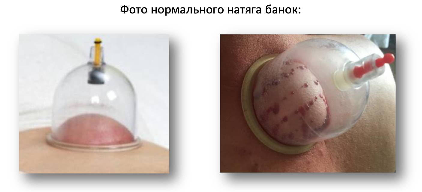 На фото выше, кожа натянута ниже половины от высоты самой банки. В данном случае можно натянуть еще немного (на пару миллиметров выше), если это не вызовет дискомфорта и болевых ощущений у пациента.