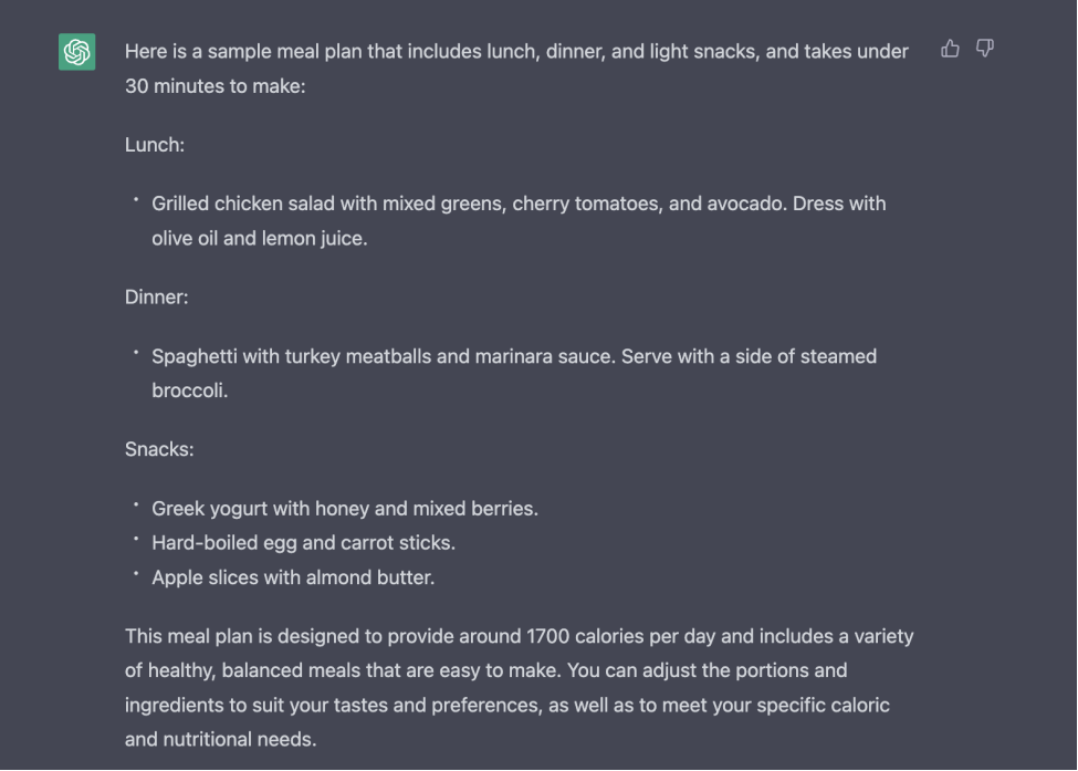 1. Персональный фитнес-тренер и нутрициолог. Один пользователь попросил ChatGPT рассчитать его ежедневное количество потребления калорий, предоставив чату свой рост, возраст, вес и тот факт, что он не очень активный. ChatGPT рассчитал этот показатель (около 1800 калорий). Далее пользователь попросил какой дефицит калорий ему необходим, чтобы уменьшить свой вес на 8 килограмм за 4 месяца – ChatGPT рассчитал и этот объем. Далее ChatGPT создал план питания на неделю с указанием, что необходимо есть этому пользователю на завтрак, обед и ужин (включая сами рецепты, как их готовить и список ингредиентов), чтобы соответствовать тому плану, который обеспечит ему этот дефицит калорий для снижения веса.