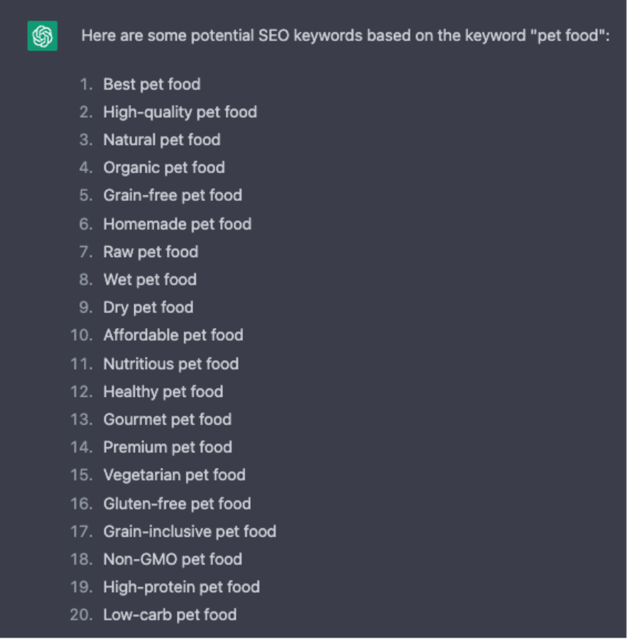 Предположим, у вас есть блог или сайт, который вы хотите раскрутить с помощью SEO оптимизации, т. е. использования ключевых слов, чтобы пользователи находили вас с помощью поисковых запросов. Вы можете попросить ChatGPT создать для вас список из 100 ключевых слов вокруг определенной тематики, и даже попросить предложить названия статей, которые можно было бы написать и разместить на этом сайте. Это можно использовать как для своего сайта, так и в качестве инструмента/сервиса, где вы помогаете другим пользователям подбирать ключевые слова для SEO оптимизации для их собственных проектов.