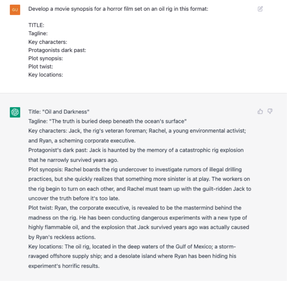 Как и во всем текстовом креативе, ChatGPT показал хорошие результаты в создании сценариев для фильмов, пьес и книг. Вы можете предоставить ему основной посыл, или просто название, или вообще не предоставлять никакой информации, и ChatGPT выдаст вам готовый новый сценарий по своему усмотрению.