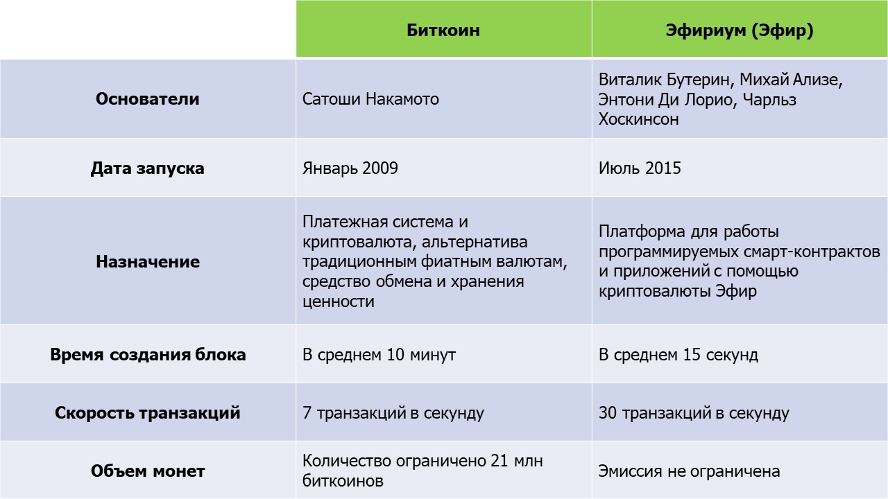 Таким образом, создание биткоина и эфириума имело под собой различные цели. Если биткоин был создан как альтернатива национальным валютам, средство обмена и хранения ценности, то эфириум был создан как платформа для создания децентрализованных приложений и смарт-контрактов, которые бы работали с помощью собственной валюты – эфира (ETH).