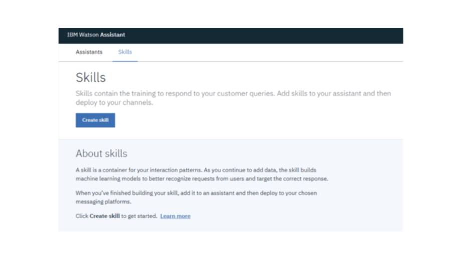 И когда вы создаете чат-бота в Watson Assistant, первое, что вы делаете, это создаете Навык диалога dialog Skill, который будет содержать эти три компонента.
