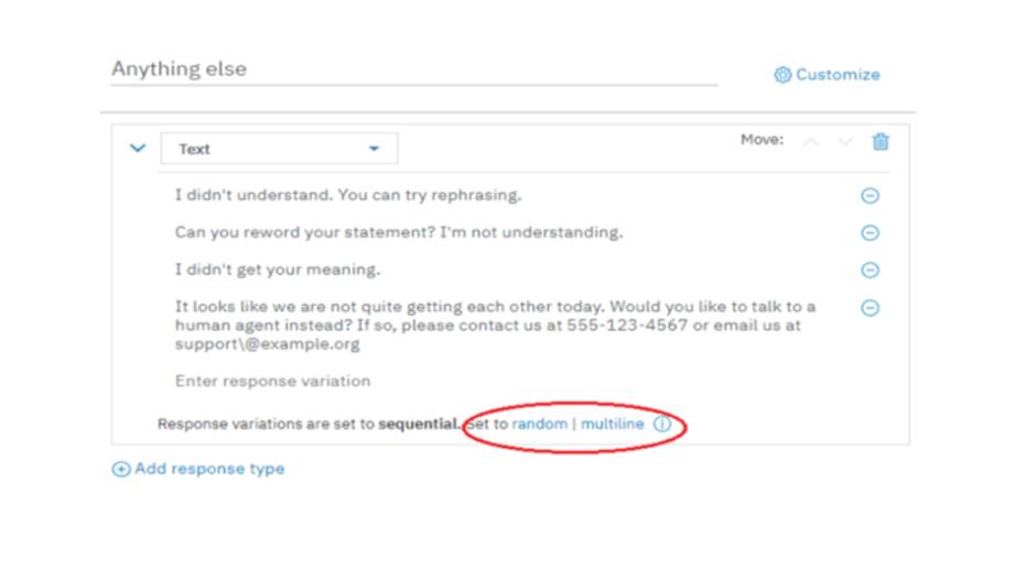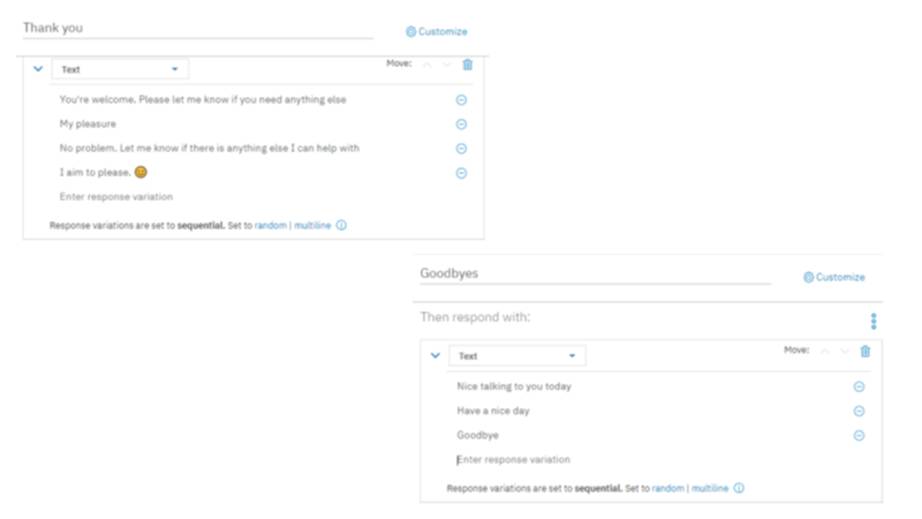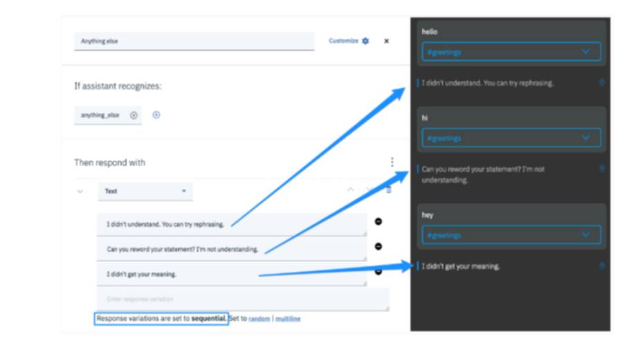 Мы можем предоставить несколько вариантов ответа, а затем решить, следует ли их выдавать по порядку при каждом запуске этого узла, или случайным образом из списка, который мы предоставляем.
