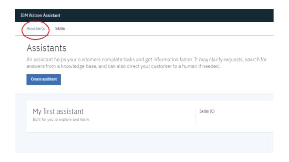 В панели IBM Watson Assistant есть вкладка помощников Assistants.