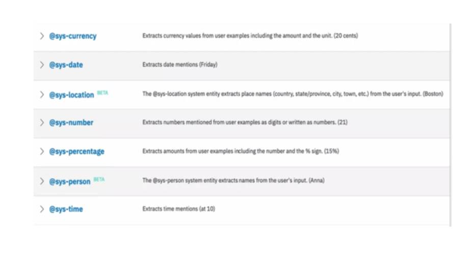 Есть предопределенные системные сущности, которые вы можете добавлять для чатбота.