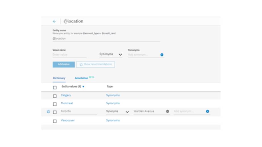 Также вы можете нажать кнопку Показать рекомендации, чтобы выбрать синонимы из списка, предоставленного Watson.