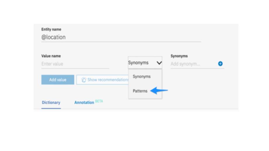 Также, значения сущностей также могут иметь шаблоны, которые добавляются в раскрывающемся списке Синонимы.