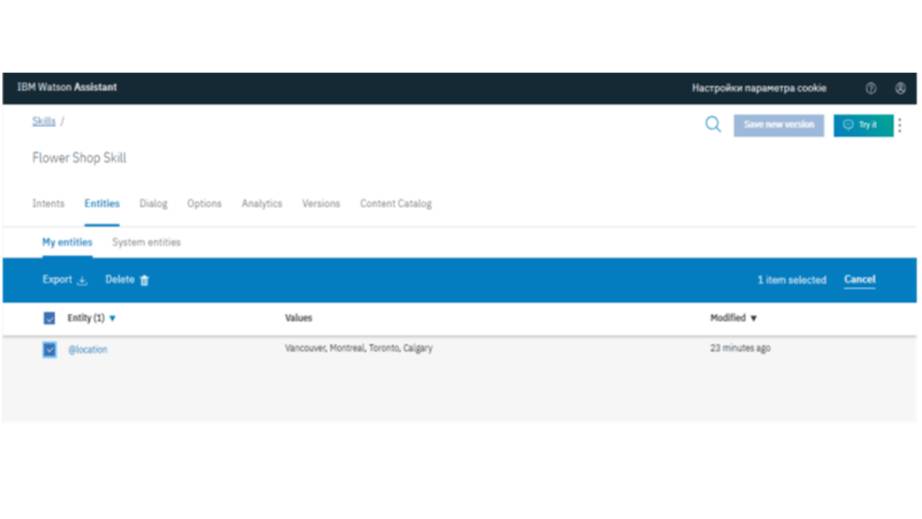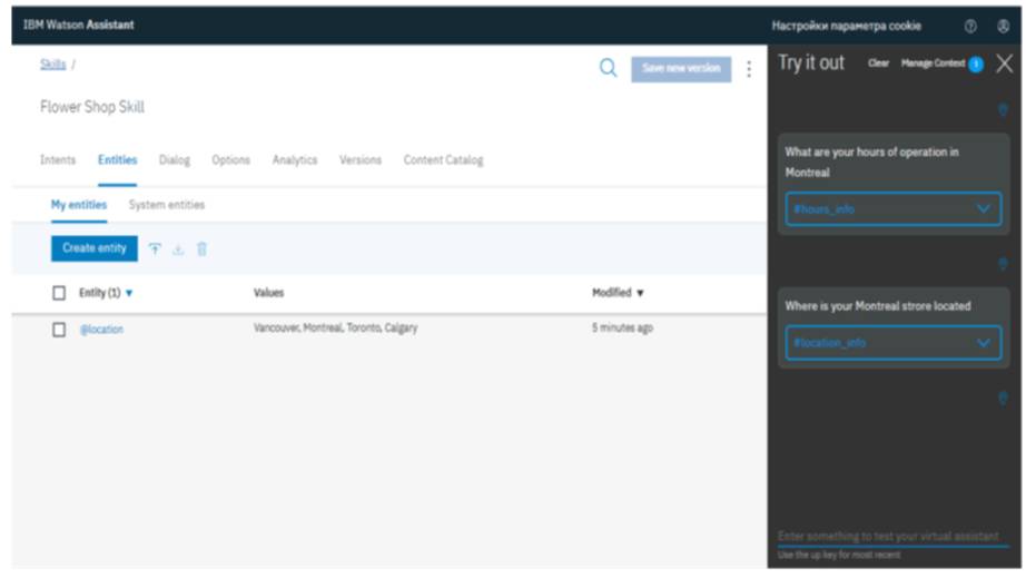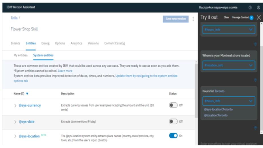Вы заметите, что обнаружены сущности @sys-location и @location.