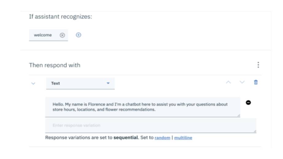 Первый узел – это Welcome, который обрабатывает приглашение чатбота.