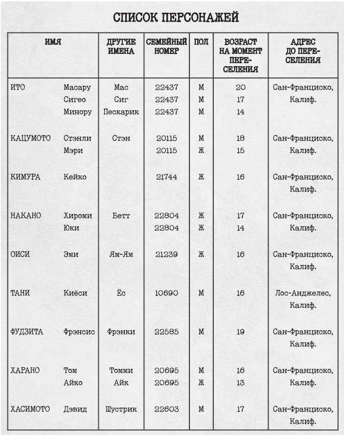 * * *Десять дней тому назад президент Рузвельт учредил Военное управление по переселению, федеральное агентство, которое должно было решать, как выдворять нас из военных зон, где мы были правительству не нужны. Мы попросту не знаем, кого из нас переселят. И как это будет происходить. И когда.