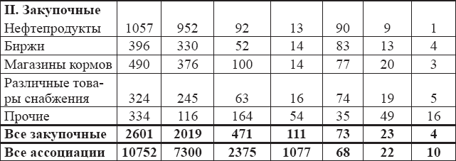 Таблица на следующей странице показывает, что доля акционерных и неакционерных ассоциаций сильно варьируется в разных группах рассматриваемых ассоциаций. Кооперативы акционерного типа обычно, хотя и не обязательно, более многочисленны в тех областях экономической деятельности, где требуются значительные вложения капитала (элеваторы, маслозаводы и т. д.), и где такой капитал не может быть мобилизован в каких-либо других областях, тогда как неакционерный, некоммерческий вариант лучше адаптирован к организациям, где потребность в значительных средствах не актуальна. Тип акционерных ассоциаций охватывает широкий круг кооперативных образований. Самым представительным и занимающим видное место в истории кооперативного движения является кооперативный магазин, созданный Обществом равноправных (справедливых) пионеров Рочдейла[130]. В отличие от неакционерных, некоммерческих кооперативов этот тип ассоциации обладает почти всеми структурными характеристиками акционерного общества: