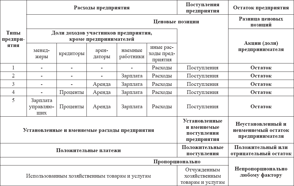 Предпринимательский доход является коррелятом договорных доходов, полученных на предприятиях и через них, и его всестороннее понимание возможно только в связи с механизмом формирования этих доходов в рамках предприятия. Таким образом, предпринимательский доход – это остаток между доходами предприятия (ценами) и его расходами (ценами). Таким образом, важной особенностью предпринимательского дохода является то, что в отличие от договорных доходов участников (которые являются ценами) предпринимательский доход не является ценой, а является разницей между ценами, уплаченными и полученными внутри предприятия. Стоит отметить, что такой остаточный предпринимательский доход является специфическим доходом предприятия и противопоставляется договорным доходам участника, сгруппированным в общем отношении к этому предпринимательскому остатку (прибыль-убыток).