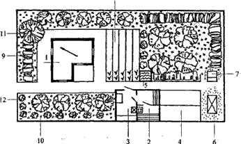 Рис. 1. План дачного участка: 1 – жилой дом; 2 – баня; 3 – летняя кухня; 4 – теплица; 5 – емкость с водой; 6 – компостная яма; 7 – туалет; 8 – огород; 9 – живая изгородь; 10 – цветники; 11 – плодовые деревья; 12 – ягодные кустарники.