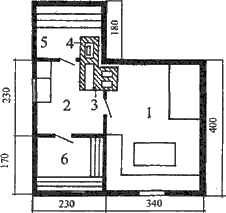 Рис. 2. План бани: 1 – жилая комната; 2 – кухня; 3 – печь кухни; 4 – каменка бани; 5 – парная и моечная; 6 – веранда.