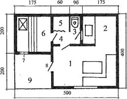 Рис. 3. План бани: 1 – жилая комната; 2 – кухня; 3 – туалет; 4 – раздевалка-предбанник; 5 – душевая комната; 6 – парная; 7 – окно; 8 – двери; 9 – веранда.
