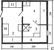 Рис. 4. План бани: А – для двух человек; В – для трех человек; С – для двух человек; 1 —вешалка; 2 – предбанник; 3 – парная; 4 – моечная; 5 – скамья; 6 – полок; 7 – лежанка; 8 – двери;9 – печь-каменка; 10 – стол; 11 – шкафы.