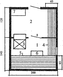 Рис. 5. План бани: 1 – парная, совмещенная с моечной; 2 – предбанник; 3 – печь-каменка; 4 – полок сиденье; 5 – полок-лежанка; 6 – подставка; 7 – скамейка; 8 – двери.