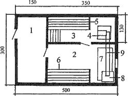 Рис. 7. Семейная баня на 6–8 человек: 1 – предбанник; 2 – моечная; 3 – парная; 4 – П-образная печь; 5 – полок; 6 – скамейка; 7 – ванна с холодной водой; 8 – бак с водой; 9 – дымоход.