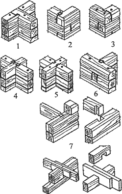 Рис. 19. Угловые соединения бруса: 1 – соединение внутренней стены с наружной на шкантах; 2 – соединение на шпонках; 3 – соединение на шкантах; 4 – пересечение стен на шпонках; 5 – пересечение стен на шкантах; 6 – соединение внутренней стены с наружной на шпонках; 7 – соединение балок перекрытий со стенами.