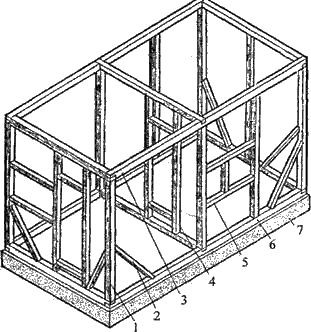 Рис. 23. Каркас стен из бруса: 1 – стойка; 2 – раскос; 3 – балка верхней обвязки; 4 – дополнительная стойка для дверной коробки; 5 – продольный брус; 6 – балка нижней обвязки; 7 – фундамент.