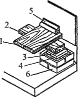 Рис. 26. Цокольное перекрытие по лагам: 1 – доска пола; 2 – лага; 3 – прокладка; 4 – рубероид; 5 – плинтус; 6 – кирпичный столбик.