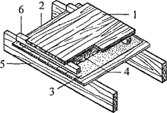 Рис. 28. Утепление пола: 1 – доска пола; 2 – «черновой пол», 3 – рубероид; 4 – утеплитель; 5 – балки; 6 – рейки.