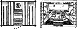 Многие дачники стремятся построить небольшую сауну в виде отдельно расположенной от дома бревенчатой избушки (см. «Бревенчатая сауна»). В целях экономии пространства, строительных материалов, материальных затрат и топлива в этой сауне совместите раздевалку и парилку. Для отопления используйте дровяную печь или электрокамин, установленный в углу парилки. Малые размеры сауны позволяют быстро ее нагревать. В ней могут одновременно париться несколько человек. Полки шириной 60 см (3 штуки) располагайте ступенями друг над другом.